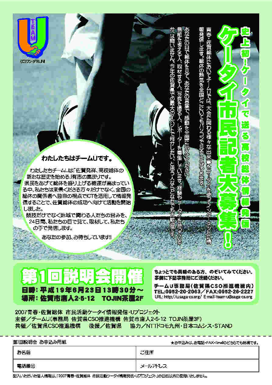 青春・佐賀総体においてチームUでは、大会に関わる様々な出来事をケータイを使ってインターネットに情報発信します。総体の熱気を全国どこにいてもパソコンで見ることができます。
